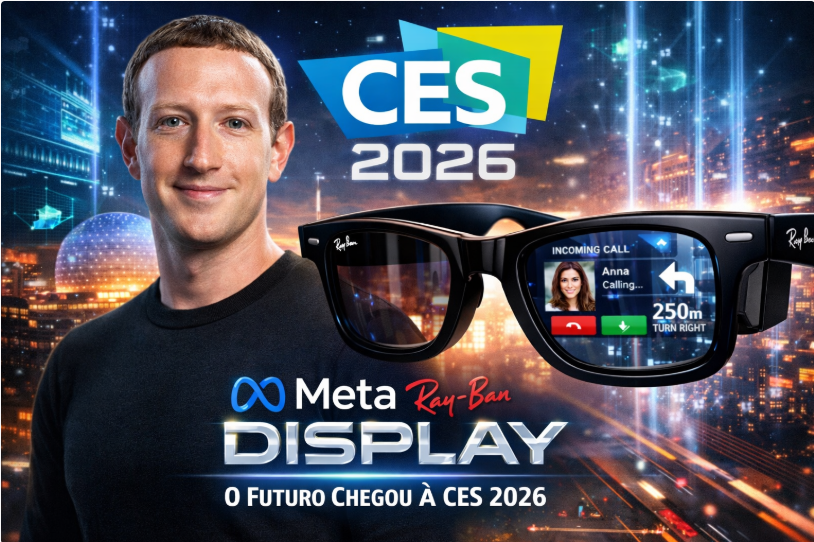 A Meta, empresa de Mark Zuckerberg — conhecida globalmente por produtos que moldam o futuro da tecnologia — voltou a surpreender no CES 2026 com novidades em sua linha de óculos inteligentes. O destaque fica por conta do Meta Ray-Ban Display, um dispositivo vestível que combina estilo clássico com funcionalidades avançadas de inteligência artificial e uma tela integrada diretamente na lente.